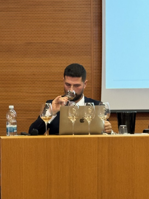 Uno dei passaggi più rilevanti riguarda la struttura dell’acino e il suo impatto enologico. Il pinot nero presenta grappoli piccoli, acini di dimensioni ridotte e un rapporto buccia/polpa elevato. Possiede inoltre un numero medio di vinaccioli superiore alla norma (3–4 per bacca), elemento che incide direttamente sul potenziale fenolico. «Uno dei preconcetti più diffusi è che il pinot nero abbia poco tannino», ha chiarito Simone. «Un conto è parlare di vino, un conto è parlare di uva».
