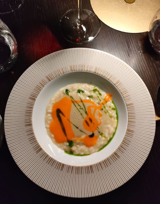 Lo abbiniamo a un risotto al burro di vongole con emulsione di datterino. Il piatto crea un ponte gustativo con la mineralità del vino, esaltando il carattere marino degli ingredienti e la loro aromaticità, lasciandosi avvolgere dalla morbidezza e gentilezza dei tannini.