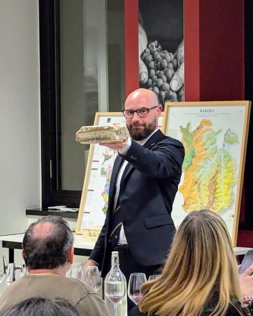 Assaggiando i tre ultimi vini, il Barolo del Comune di Serralunga è una sintesi, un punto d’incontro dei due successivi, ha potenza e avvolgenza, con un profilo olfattivo declinato su petali secchi, toni scuri, polvere di caffè, un accenno di tamarindo, di foglia di tè.