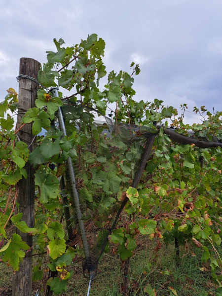 La rete svolge così una duplice funzione: di palizzatura e ombreggiante, garantendo una crescita omogenea dei grappoli, protezione dalla grandine e anche dai possibili danni causati da cinghiali o caprioli.