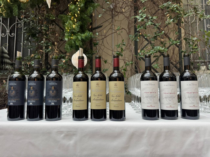 La degustazione è stata condotta da Giuseppe Carrus, curatore della guida Vini d’Italia del Gambero Rosso, con l’assaggio di cinque Vino Nobile di Montepulciano “Pieve”, tutti dell’annata 2022: una scelta che ha permesso di confrontare vini provenienti da aree diverse del territorio mantenendo costante il millesimo.