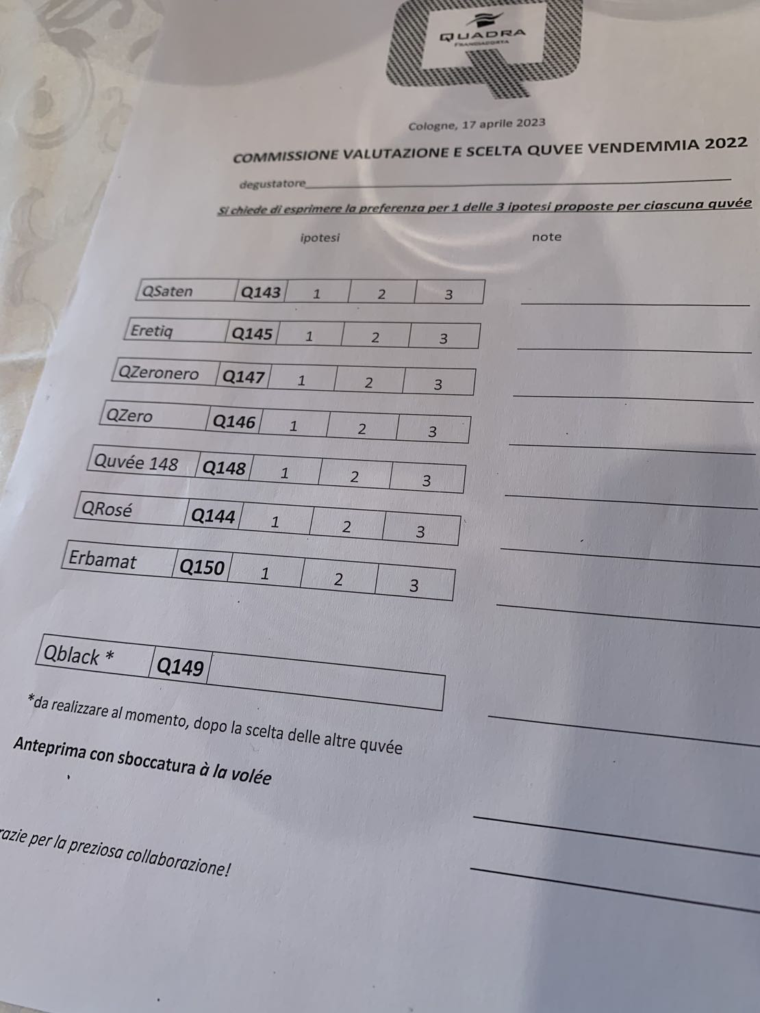 La convocazione è per una mattina di aprile, nella sede della cantina: le cuvée da selezionare sono tutte del millesimo 2022 e sono destinate alla creazione degli spumanti più iconici della cantina: tre proposte per ognuno dei sette vini che diventeranno spumanti. La vendemmia 2022 è la ventesima di Quadra e la quarantesima di Falcetti: uno strano gioco di numeri e moltiplicatori che sembra sottolineare la magia del momento.