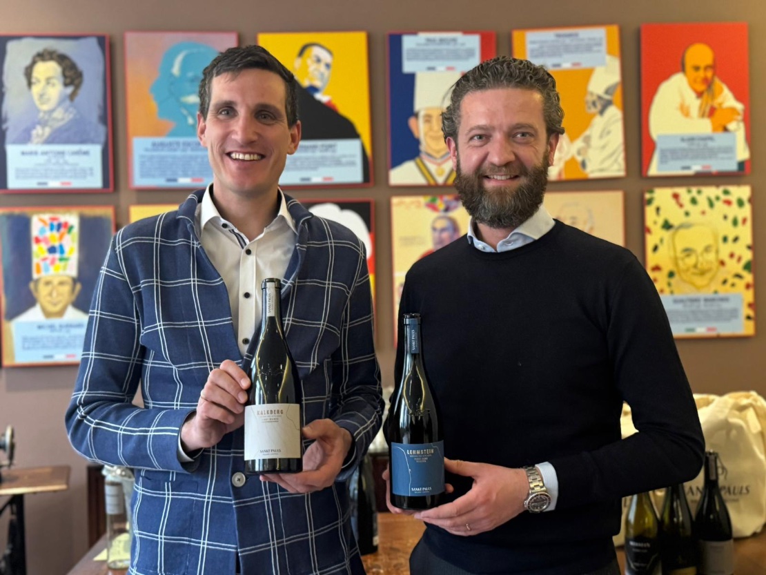 La degustazione milanese di Sankt Pauls si apre come un momento di dialogo e racconto, più che come una semplice presentazione di vini. A condurla sono Tobias Leimgruber, direttore marketing e vendite, e Philipp Zublasing, enologo, che sottolineano fin da subito il valore simbolico dell’incontro.