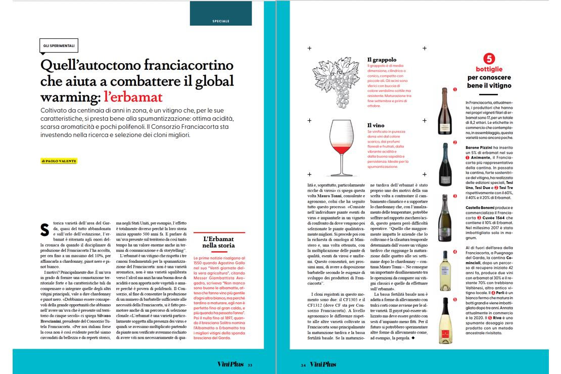 Clicca sull'immagine per scaricare il PDFL’erbamat è un vitigno che rispetta i tre canoni fondamentali per la spumantizzazione del Franciacorta: non è una varietà aromatica, non è una varietà squilibrata verso l’alcol ma anzi ha una buona dose di acidità e non apporta note vegetali o amare perché è povera di polifenoli. Il Consorzio, al fine di consentire la produzione di un numero di barbatelle sufficiente alle necessità della Franciacorta, si è fatto promotore anche di un percorso di selezione clonale.«L’erbamat è una varietà particolarmente soggetta alla presenza dei virus e quindi se avessimo moltiplicato partendo da piante non verificate avremmo rischiato di avere viti non necessariamente di qualità e, soprattutto, particolarmente ricche di virosi» ci spiega questa volta Mauro Tonni, consulente e agronomo, colui che ha seguito tutto questo processo. «Consiste nell’individuare piante esenti da virus e impiantarle in un vigneto di confronto da dove vengono poi selezionate le piante qualitativamente migliori. Si procede poi con la richiesta di omologa al Ministero e, una volta ottenuta, con la moltiplicazione delle piante di qualità, esenti da virosi e uniformi. Questo consentirà, nei prossimi anni, di avere a disposizione barbatelle secondo le esigenze di sviluppo dei produttori di Franciacorta”. I cloni registrati in questo momento sono due: il CF1305 e il CF1312 (dove CF sta per Consorzio Franciacorta). A livello agronomico le differenze rispetto alle altre varietà coltivate in Franciacorta sono principalmente la maturazione tardiva e la bassa fertilità basale. Se la maturazione tardiva dell’erbamat è stato proprio uno dei motivi della sua scelta volta a contrastare il cambiamento climatico e a supportare lo chardonnay che, con l’innalzamento delle temperature, potrebbe soffrire nel rapporto zucchero/acidi, questo genera però difficoltà operative. “Quello che maggiormente impatta le aziende che lo coltivano è la sfasatura temporale determinata dall’essere un vitigno tardivo che raggiunge la maturazione dalle quattro alle sei settimane dopo lo chardonnay – continua Mauro Tonni –. Ne consegue un importante disallineamento tra le operazioni da compiere sui vitigni classici e quelle da effettuare sull’erbamat». La bassa fertilità basale non è adatta a forme di allevamento con tralci corti come avviene per le altre varietà. Il guyot può essere utilizzato ma deve essere gestito con sesti d’impianto meno fitti. Per il futuro si potrebbero sperimentare altre forme di allevamento come, ad esempio, la pergola.